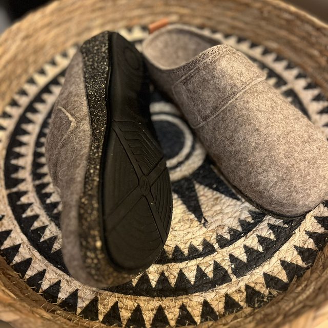 Bequeme Filzpantoffel aus Alpaka mit Korksohle. Auch für Draussen geeignet. Herausnehmbares Fußbett. Gr. 37-39. Bitte während des Bestellvorgangs im Feld "Nachricht an den Händler" Größe angeben.