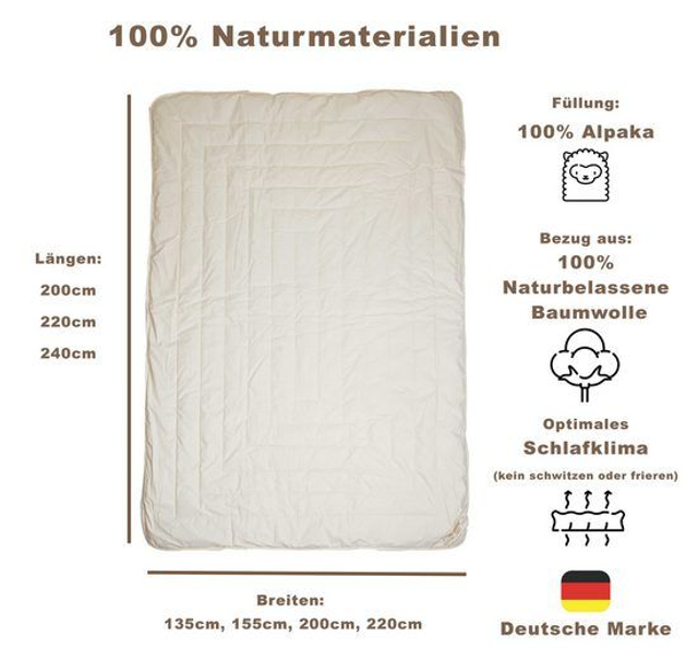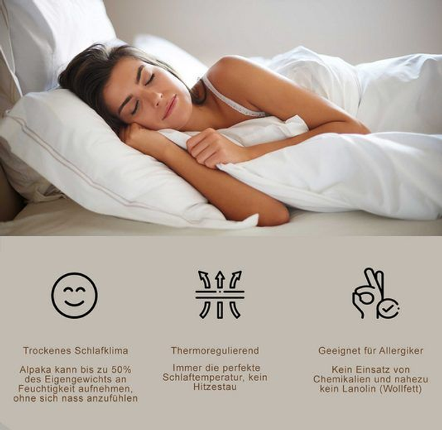 Die 4-Jahreszeitendecke mit einer Füllung aus 100% Alpakawolle eignet sich bestens als Ganzjahresdecke. Sie besteht aus zwei separaten, unterschiedlich dicken Decken die jeweils alleine oder zusammengeknöpft verwendet werden können. Alpaka Wolle ist sehr temperaturausgleichend und hält schön warm ohne dabei einen Hitzestau zu verursachen. Alpakavlies ist in der Lage bis zu 50% ihres Eigengewichts an Feuchtigkeit aufzunehmen - ohne sich feucht anzufühlen. Dadurch bleibt die Bettdecke nachts trocken und Sie geraten nicht ins Schwitzen. Eine Alpakabettdecke bietet ein optimales Schlafklima und ermöglicht einen tiefen und erholsamen Schlaf. Sie schlafen ruhiger und entspannter bei einer angenehmen Temperatur und wachen morgens fit und erholt wieder auf. Die Decken sind pflegeleicht & antiallergen. Es reicht völlig aus, sie regelmäßig zu lüften, um die Feuchtigkeit wieder abzugeben. Maße: 135x200 cm. Füllung Sommerdecke 700g, Winterdecke 1400g. Made in Germany.